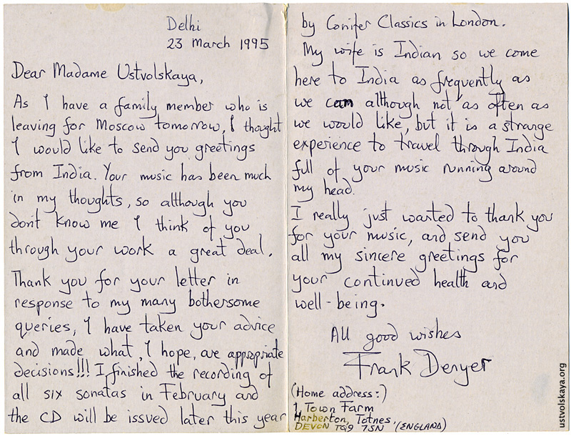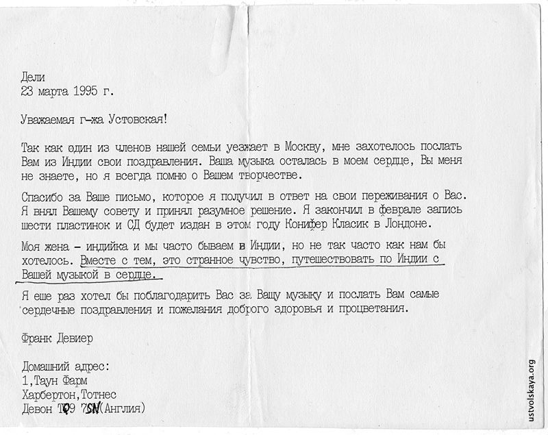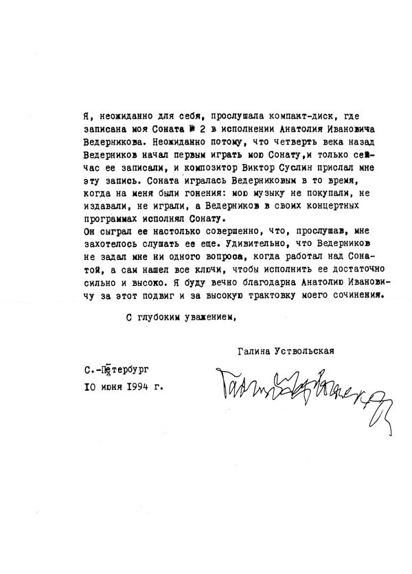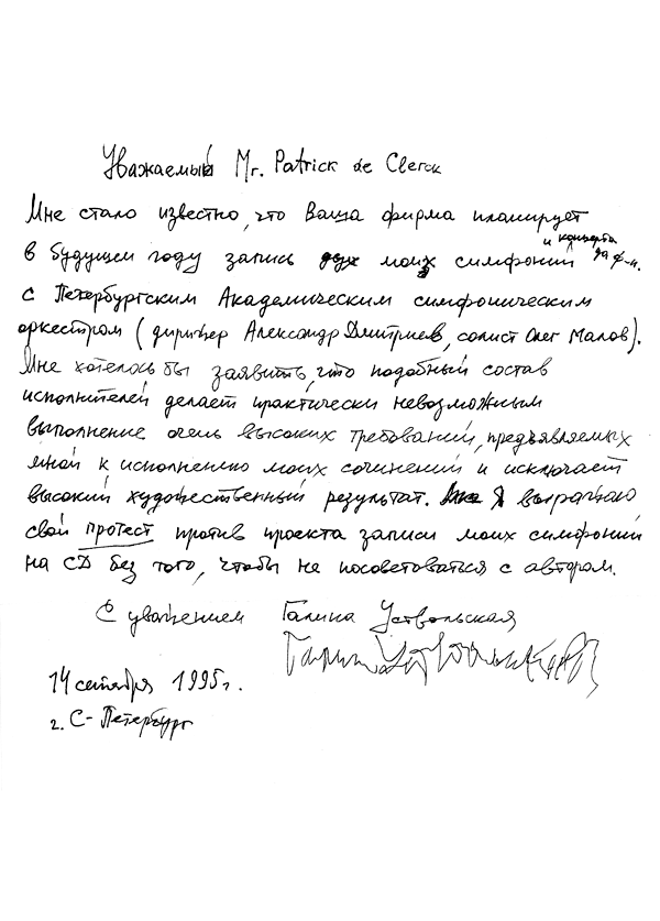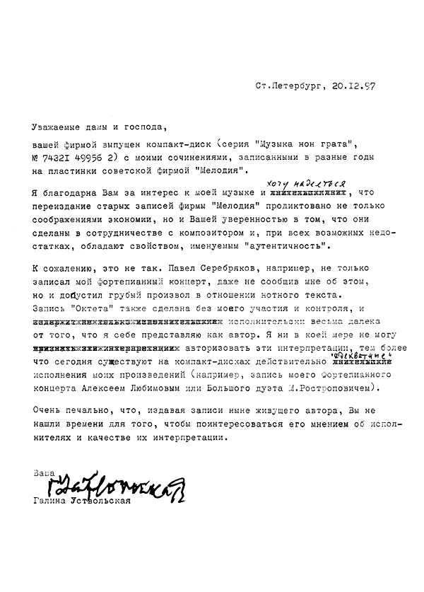 - Письмо Г. Уствольской касательно переизданий её старых записей (письмо на немецком)