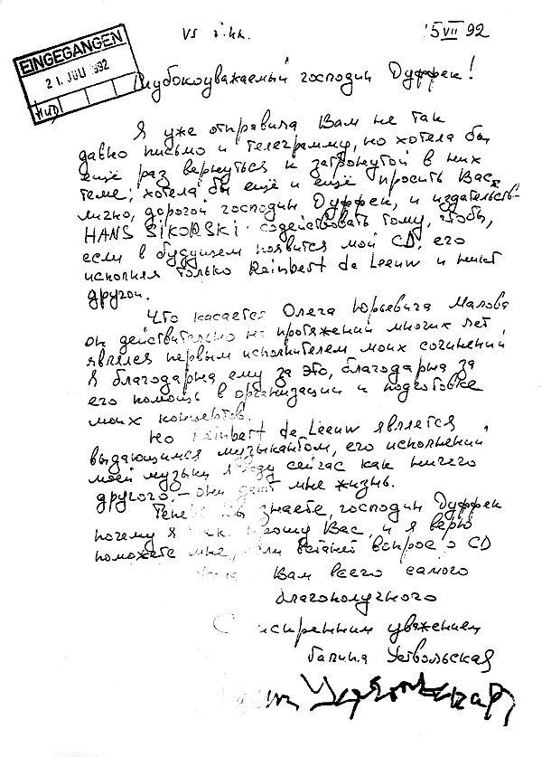 - Письмо Г. Уствольской г-ну Дуффеку (издательство Hans Sikorski) касательно О. Малова и Р. де Леу