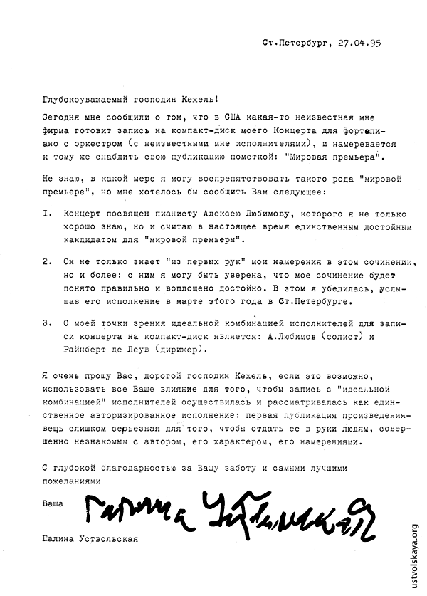 - Письмо Г. Уствольской г-ну Кёхелю касательно исполнения Концерта для фортепиано с оркестром