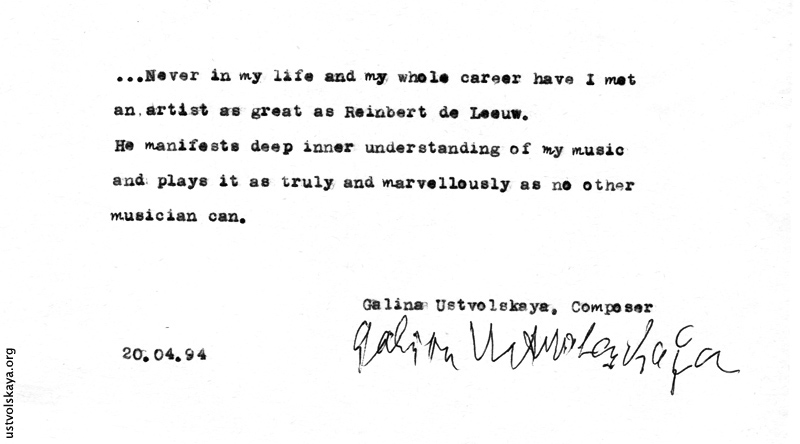 Галина Уствольская долго ожидала своего исполнителя. И судьба наградила её. Она при жизни услышала свою музыку такой, какой она её слышала сама. Самыми лучшими исполнителями своей музыки она считала Анатолия Ивановича Ведерникова, Рейнберта де Леу, Фрэнка Деньера, Маркуса Хинтерхойзера, Алексея Любимова, Веру Бетс, Ивана Соколова, Мстислава Ростроповича, Дэвида Ардена,