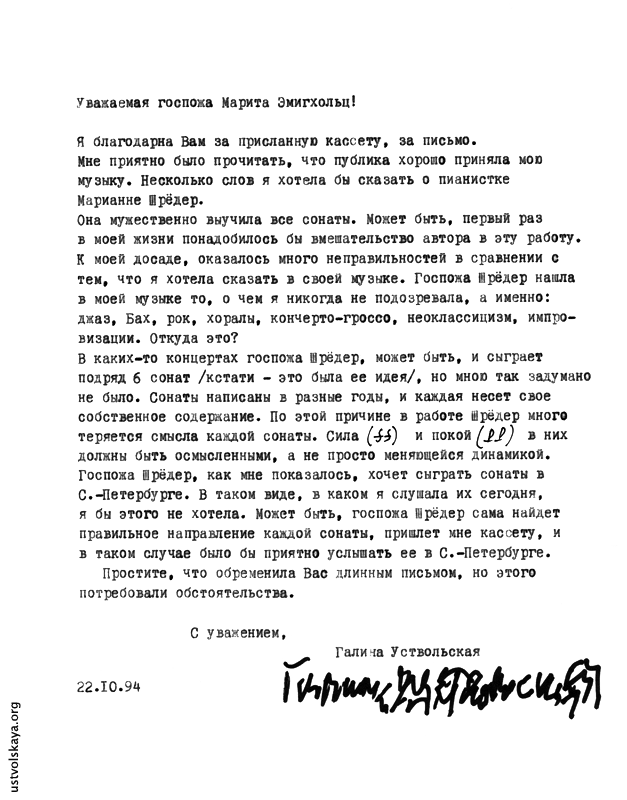 - Письмо Г. Уствольской г-же Марите Эмигхольц касательно игры г-жи Марианны Шрёдер